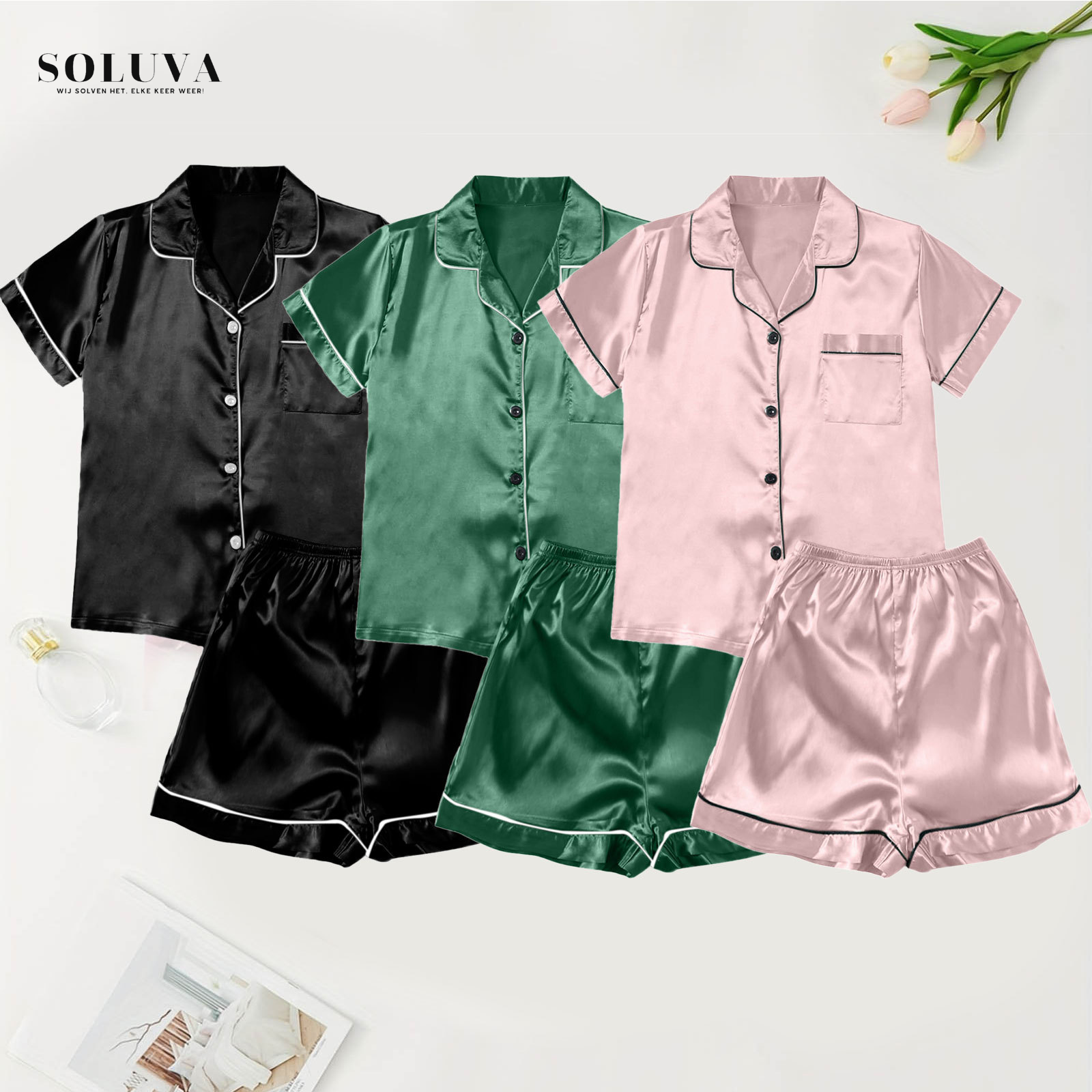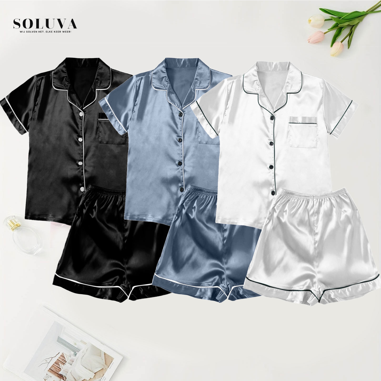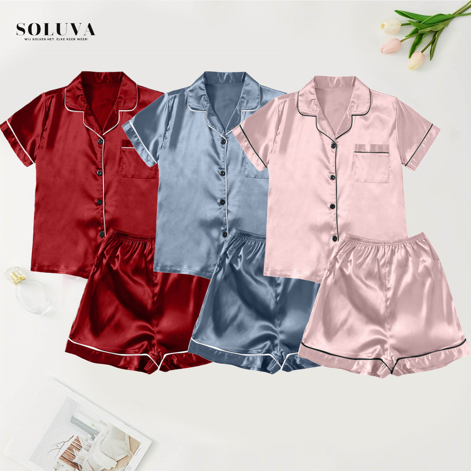 Ervaar ultiem comfort tijdens warme nachten met de Zijdezachte Zomerset. Het zijdezachte polyester satijn houdt je koel en zorgt voor een ongeëvenaarde nachtrust. De comfortabele elastische tailleband en de elegante afwerking maken deze set de perfecte mix van stijl en gemak.